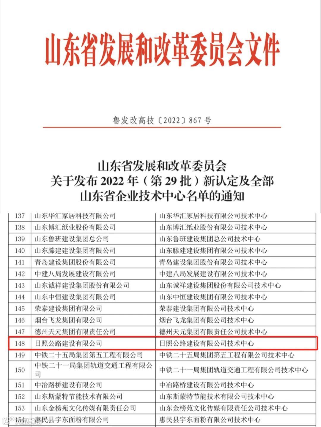 10月11日,2022年度山东省企业技术中心评选结果出炉,集团日照公路建设有限公司技术中心成功入选,标志着该公司在科技创新和行业领域取得的经济、社会效益得到了社会广泛认可。