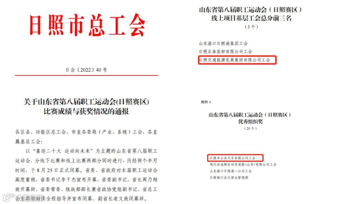本届运动会,集团广大干部职工积极响应、踊跃参与,掀起了全民健身热潮,并代表日照市参与了山东省第八届职工运动会闭幕式日照赛区的视频录制。最终,集团在健步走、仰卧起坐、跳绳共三项线上活动获得日照赛区线上项目基层工会总分第三名,日照市公共汽车有限公司获得日照赛区优秀组织奖。