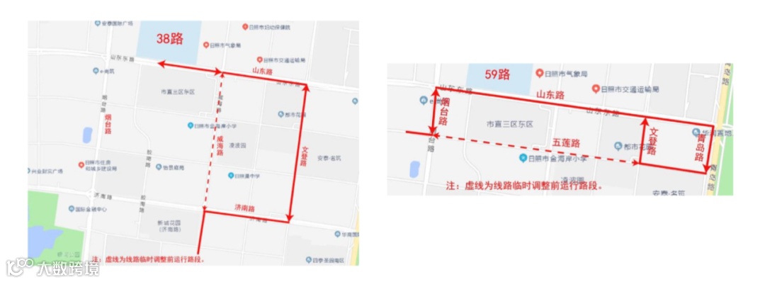 38路:威海路(山东路-济南路)路段暂停运行,双向绕行山东路(威海路-文登路)、文登路(山东路-济南路)、济南路(文登路-威海路)路段。临时取消“金海岸小学、日照港中学”站,临时增设“市交通运输局、都市花园、四季圣园北区、济南路环翠路”站。