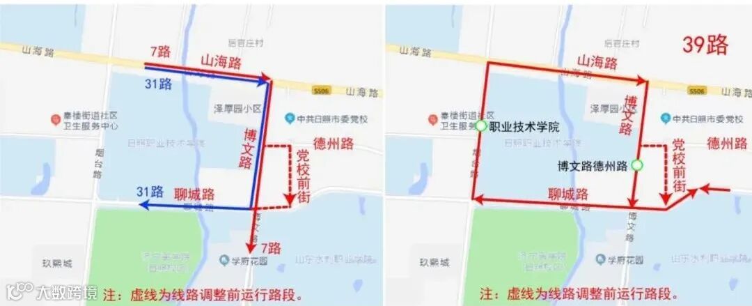 39路,起讫站由“职业技术学院”调整为“博文路德州路”。原运行德州路(博文路-党校前街)、党校前街(德州路-聊城路)、聊城路(党校前街-博文路)路段停止运行,调整为博文路(德州路-聊城路)路段运行。撤销“市委党校”站,增设“博文路德州路(路西)、前官庄(路南)”站。