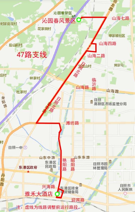 原运行日照北路(山海二路-山海四路)路段停止运行,调整为山海二路(日照北路-临沂北路)、临沂北路(山海二路-山海四路)、山海四路(临沂北路-日照北路)路段运行。撤销“许家官庄村、三奇医疗(路东)”站,增设“香山红叶集团、山海二路临沂北路、申家坡便民市场(路东)、七星机械、申家坡、申家坡北(路北)、山海四路日照北路(路南)”站。