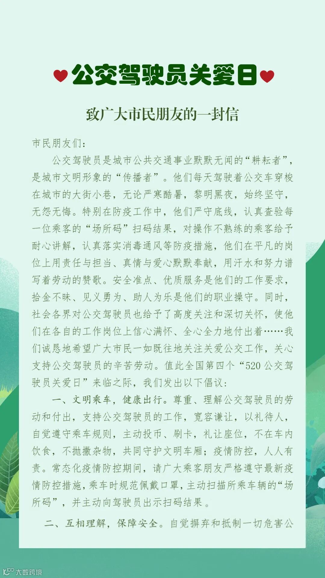 【公交驾驶员关爱日】致广大市民朋友的一封信