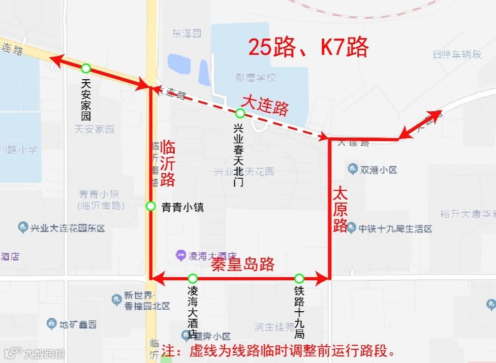 25路、K7路原运行大连路(太原路-临沂路)路段停止运行,临时调整为太原路(大连路-秦皇岛路)、秦皇岛路(太原路-临沂路)、临沂路(秦皇岛路-大连路)路段运行,临时撤销“兴业春天花园”站。25路临时增设“铁路十九局(路北)、凌海大酒店、青青小镇”站,K7路临时增设“青青小镇”站。
