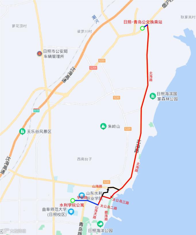 线路由烟沪线“日照-青岛公交换乘站”经烟沪线、北海路(烟沪线-碧海路)、碧海路(北海路-太公岛三)、太公岛三路(碧海路-山海天路)、山海天路(太公岛三路-太公岛二路)、太公岛二路(山海天路-青岛路)、学苑路至“水利学院公寓”站。