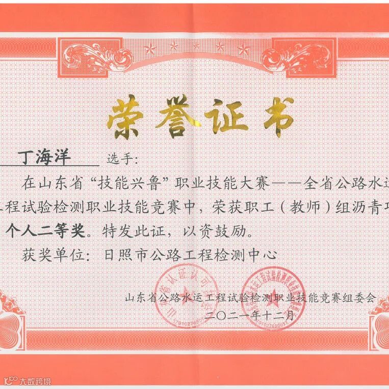 12月23日,由山东省人力资源和社会保障厅组织,山东省认证认可协会主办,山东公路技师学院承办的2021年山东省“技能兴鲁”职业技能大赛——山东省公路水运工程试验检测职业技能竞赛传来喜讯,集团建设公司丁海洋荣获沥青项目个人二等奖,厉东玉、孔美玲荣获水泥项目个人三等奖,建设公司代表队荣获水泥、沥青项目团体三等奖。