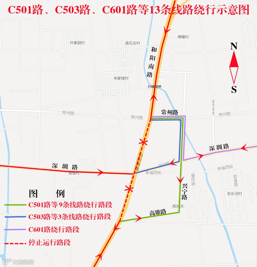 因深圳路与和阳南路交叉口实行封闭施工,影响途经该路段的城乡公交C501路等13条线路正常通行。经现场实地勘查,即日起对C501路等13条线路进行临时调整,待施工完毕后再恢复原线路运行。具体调整情况如下: