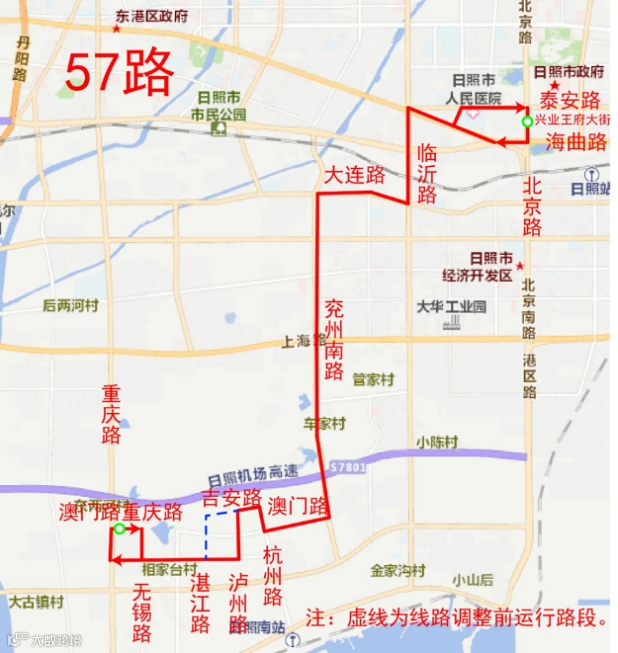 57路,原运行吉安路(泸州路-湛江路)、湛江路(吉安路-汕头路)路段停止运行,调整为泸州路(吉安路-汕头路)、汕头路(泸州路-湛江路)路段运行。增设“汕头路湛江路、泸州路汕头路”站。线路首班发车时间6:30,末班发车时间18:30。