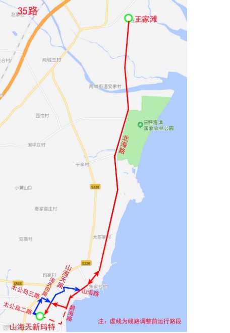 35路,原运行碧海路(太公岛三路-太公岛二路)、太公岛二路(碧海路-山海天路)路段停止运行,调整为太公岛三路(碧海路-山海天路)、山海天路(太公岛三路-太公岛二路)、太公岛二路(山海天路-海天四路)、海天四路(太公岛二路-太公岛三路)、太公岛三路(海天四路-山海天路)路段运行。撤销“教授花园、锦江大酒店、新兴花园、亲海苑、山海天实验小学(路东)”站,增设“乔家墩子(路北)、前滩西(路西)、山海天实验小学(路西)、滨海花园(路北)、太公岛三路海天四路”站。线路首班发车时间6:10,末班发车时间19:00。