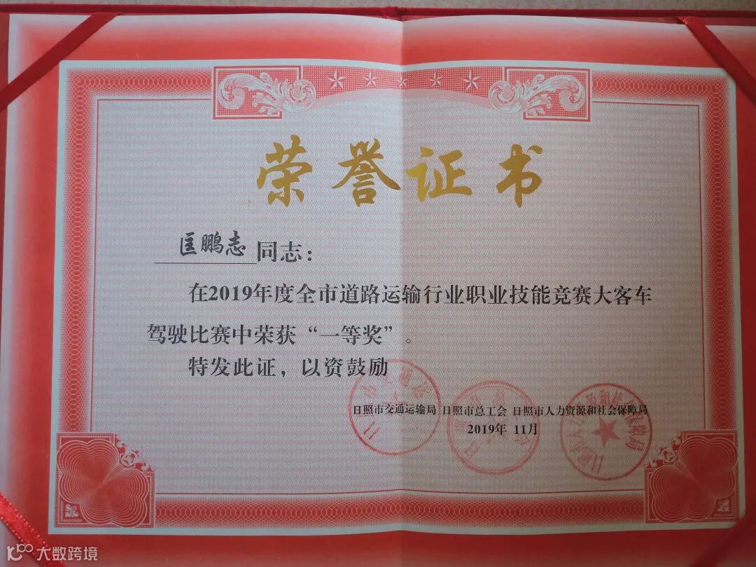 正是因为匡鹏志身上这股好学的劲,将自己磨练成为行业尖兵。2019年,匡志鹏在“全市道路运输行业职业技能竞赛”中荣获一等奖,2020年匡鹏志荣获“日照市五一先锋”荣誉称号。