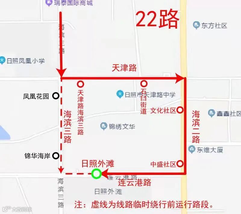 日照西综合客运站至日照外滩方向,原运行海滨三路(天津路-连云港路)、连云港路(海滨三路-日照外滩站)路段停止运行,临时调整为天津路(海滨三路-海滨二路)、海滨二路(天津路-连云港路)、连云港路(海滨二路-日照外滩站)路段运行。临时撤销“凤凰花园(路西)、锦华海岸(路西)”站,临时增设“天津路海滨三路(路南)、石臼街道(路南)、文化社区(路西)、中盛社区(路西)”站。原“凤凰花园(路西)”站的乘客可前往“天津路海滨三路(路南)”站乘车,原“锦华海岸(路西)”站的乘客可前往“日照外滩(路北)”站乘车。