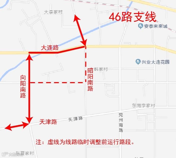 46路:原运行昭阳南路(大连路-天津路)路段停止运行,临时调整为大连路(昭阳南路-兖州南路)、兖州南路(大连路-天津路)、天津路(兖州南路-昭阳南路)路段运行。临时撤销“昭阳南路大连路(路西)、昭阳南路秦皇岛路、昭阳南路天津路”站,增设“锦绣华府小区、大连花园西门、小董家村”站。