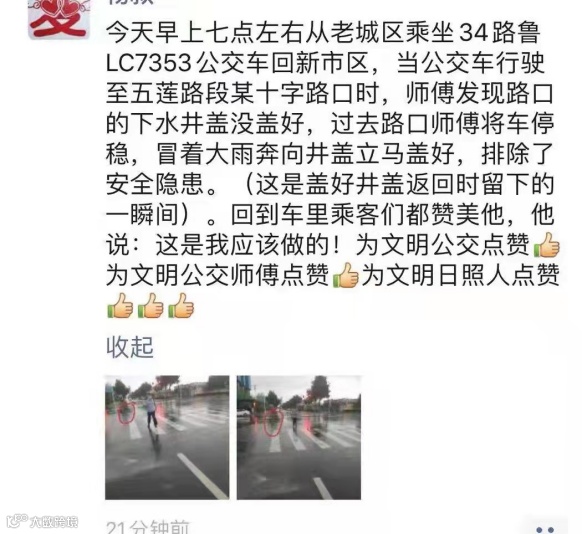 9月20日,驾驶员王桂全像往常一样,驾驶34路公交车执行当天的营运任务。上午7点10分左右,在行驶至五莲路路段时,他看到前方路口的下水井盖没有盖好,来往车辆和行人很容易发生危险。他便果断地把车停好,冒雨把井盖搬到原来的位置,排除了安全隐患,也方便了途经的车辆,受到乘客们的一致“点赞”!