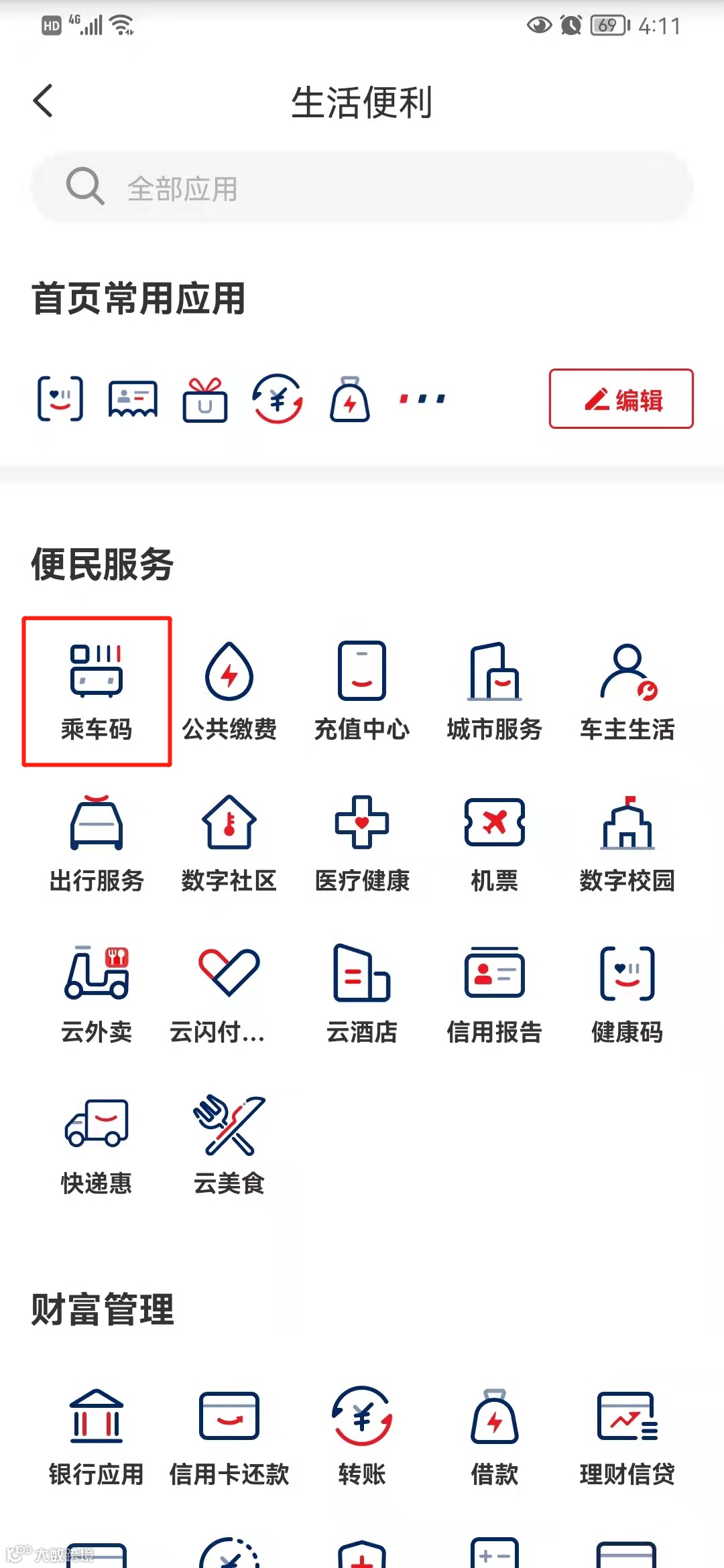 2.将城市定位至“日照市”,在首页功能栏中点击“乘车码”,若功能栏中无“乘车码”选项,可在“更多—便民服务”中查看。