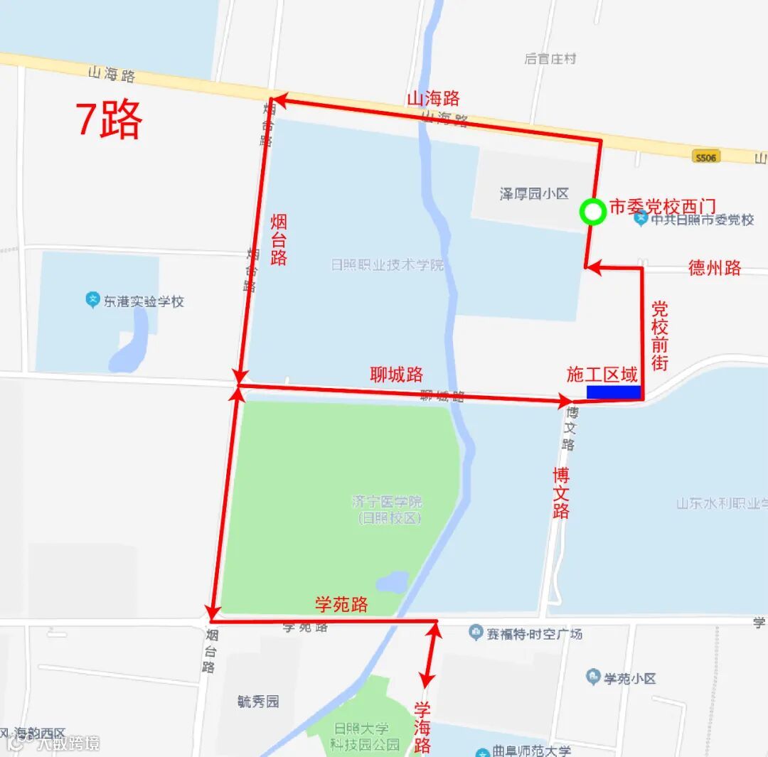 因聊城路与党校前街路口施工,致使途经该路段的公交7路无法正常通行。为最大限度减少道路施工给乘客出行带来的不便,定于8月14日起对该线路进行临时调整,待具备通车条件后再恢复原线路运行。具体如下: