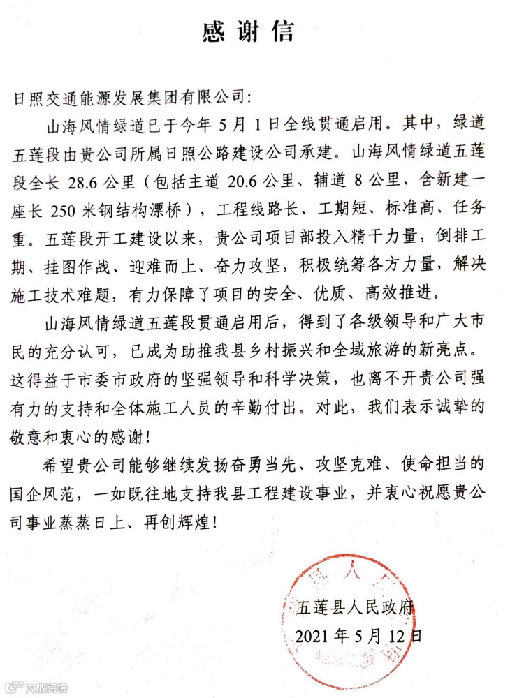 5月12日,五莲县人民政府向集团发来感谢信,感谢集团建设公司在山海风情绿道五莲段建设中的辛勤付出。