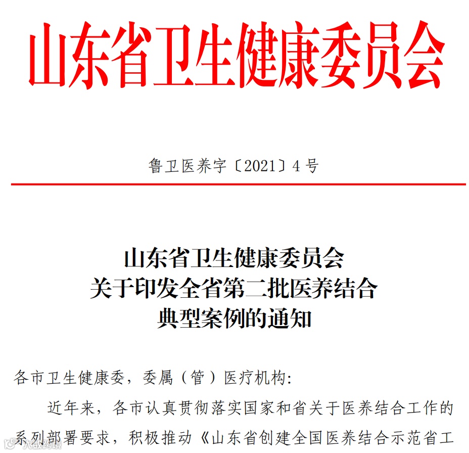 近日,山东省卫健委印发通知,梳理提炼医养结合典型案例,印发全省学习借鉴,集团颐养公寓成功入选。