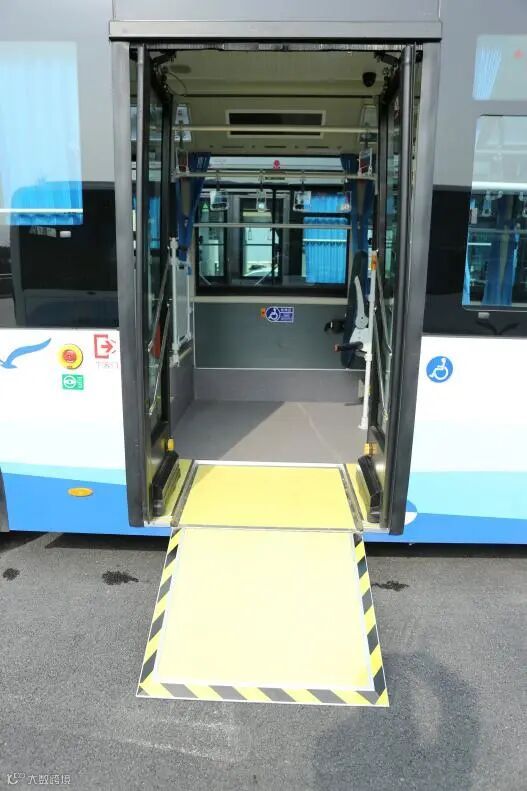 新能源纯电动公交车配置冷暖空调,尤其是配置的一级无障碍踏步,取消了原来的二级踏步模式,一步即可走入车厢。后车门设置一级无障碍踏板,踏板可展开,轮椅和推车可无障碍上下车。在车辆后门相对处,设置轮椅使用区域和靠板,供轮椅固定、倚靠,极大方便了特殊乘客的出行。