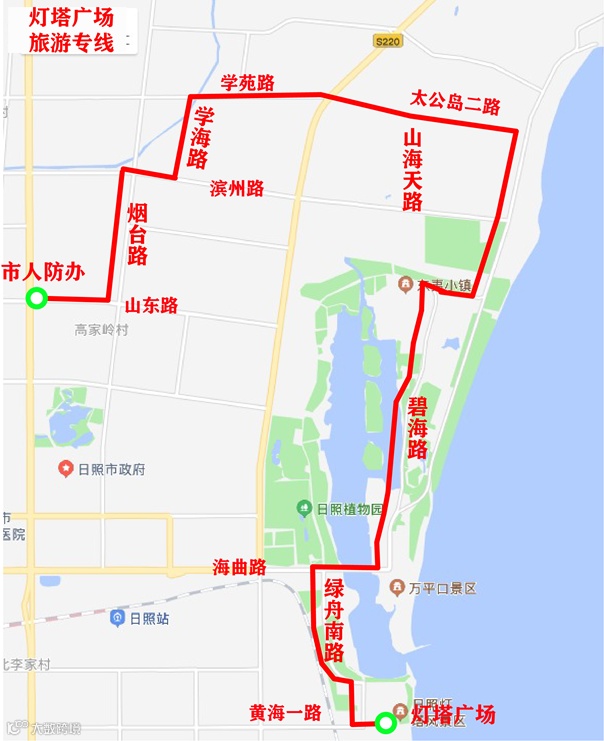 线路走向:由“市人防办”站始发,经山东路(消防支队)、烟台路(安泰国际广场、曲师大)、滨州路(曲师大北门)、学海路、学苑路(水利学院)、太公岛二路(锦江大酒店)、碧海路(东夷小镇、海洋公园)、海曲路、绿舟南路(帆赛基地)至“灯塔广场”站。停靠沿线所有公交站点,线路长度14.8公里。线路实行一票制,票价1元。