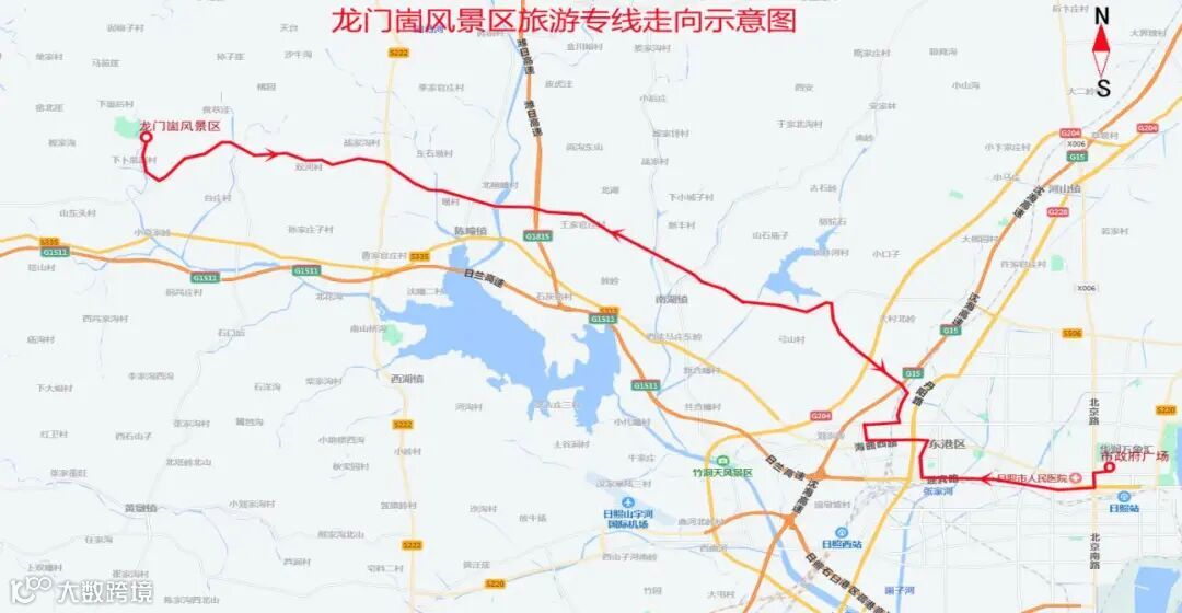 线路走向:由市政府广场始发,经北京路、迎宾路、日照路、城乡日照路首末站、海曲路、旭阳路、山东西路、和阳路、向城路、山海路至龙门崮风景区。线路全长52公里。线路实行一票制,票价3元。