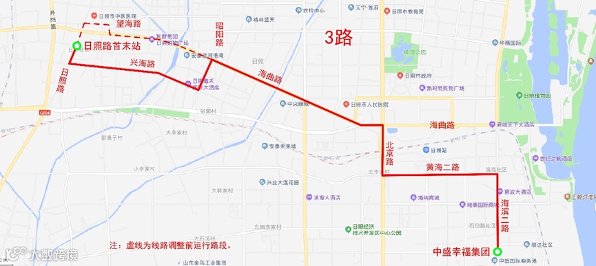 “日照路首末站”至“中盛幸福集团”方向,原运行日照路(日照路首末站至望海路)、望海路(日照路至丽阳路)、丽阳路、海曲路(丽阳路至昭阳路)路段停止运行,调整为日照路(日照路首末站至兴海路)、兴海路(日照路至昭阳路)、昭阳路(兴海路至海曲路)路段运行。