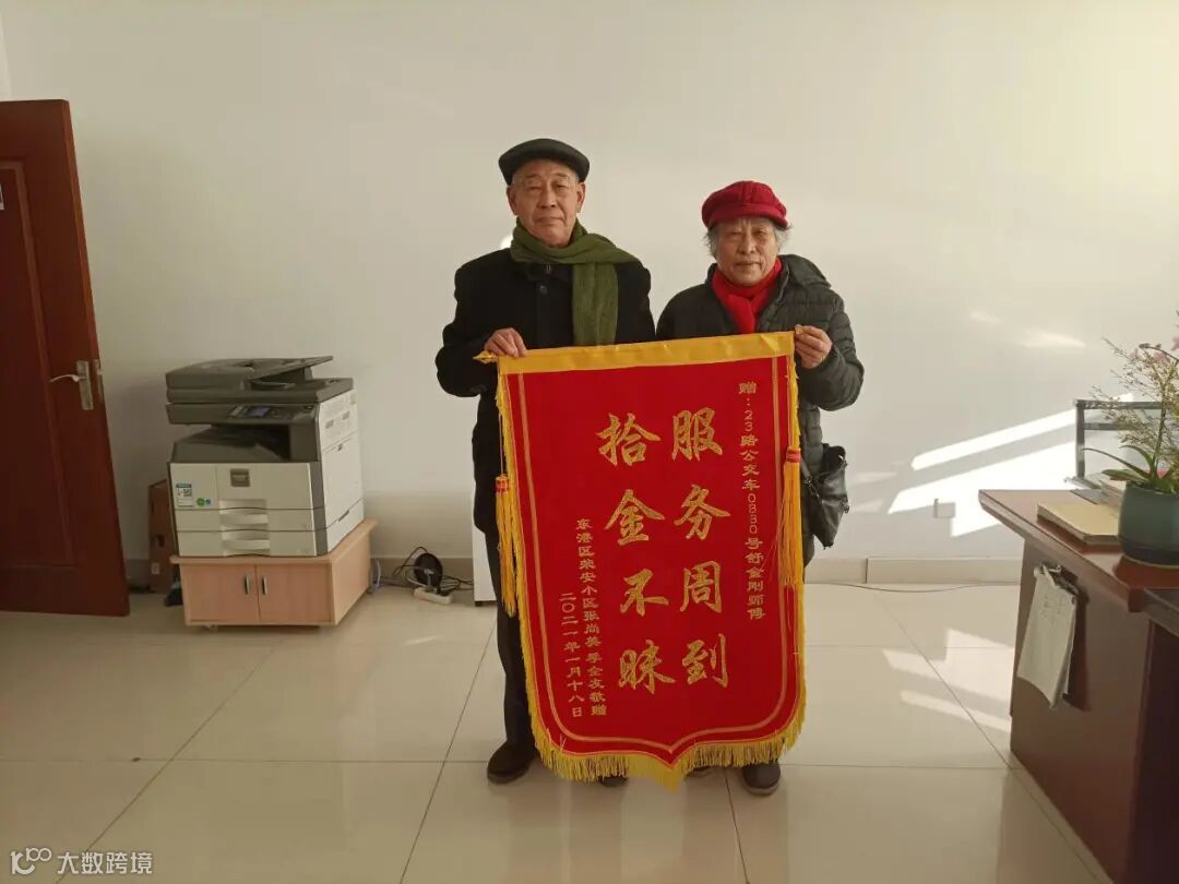 1月17日,两位老人几经询问,来到公共汽车公司办公室,将一面锦旗送到工作人员手中。