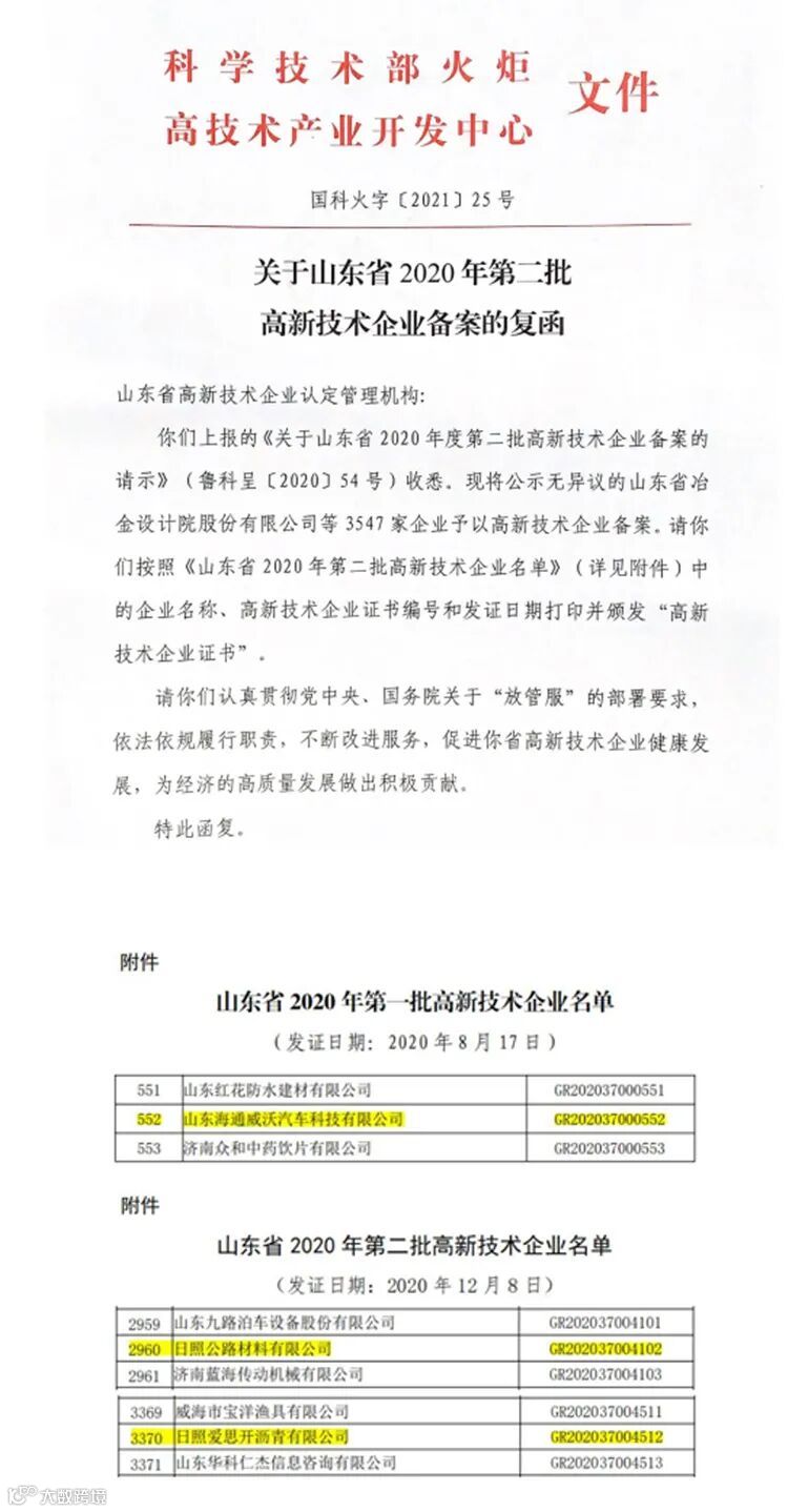 近日集团材料公司、海通威沃公司、SK沥青公司,通过国家科技部高新技术企业认定。