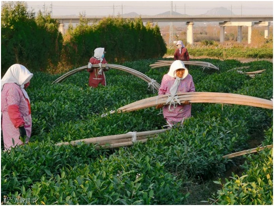 二是加盖越冬防护设施。在寒潮来袭之前,茶园热火朝天的搭建小拱棚、钢结构大棚,为茶树搭建温暖、稳固的越冬室,确保茶树安全越冬。