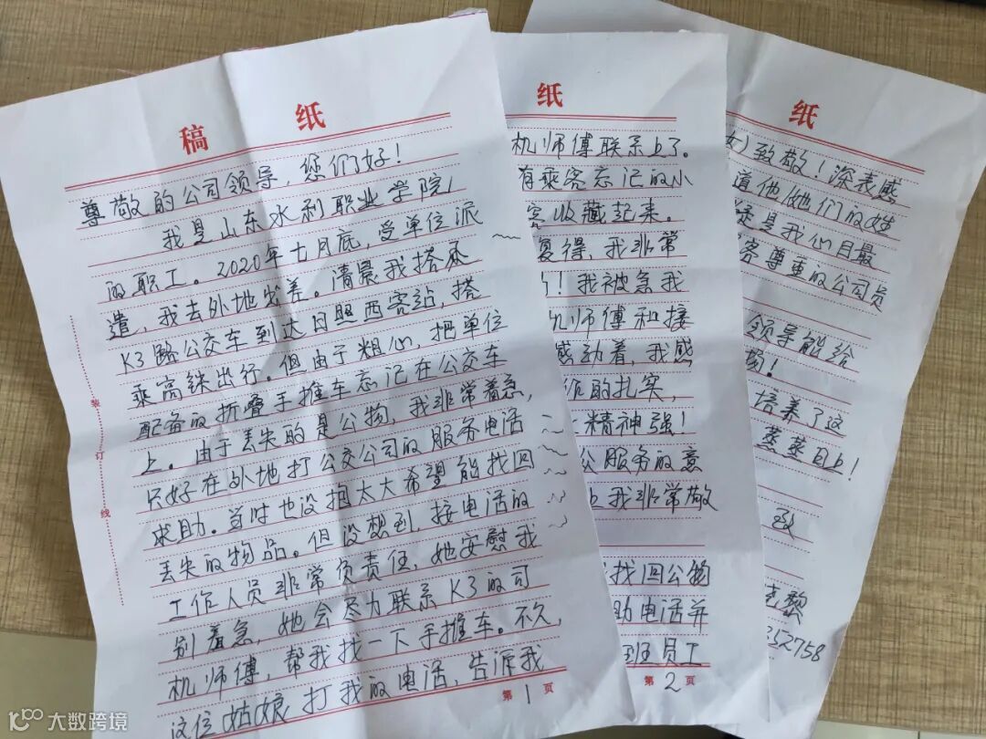 此事还要从7月底说起,高先生受单位派遣去外地出差,不慎将手推车遗忘在K3路公交车上,直至阚常凤师傅到站检查车厢卫生时,手推车才被发现。发现后他便立即送到了工作组办公室,以便乘客前来寻找。随后,办公室工作人员通过服务热线所留的联系方式联系到了失主高先生,其表示现在人出差在外地,近期无法返回,请奎山工作组的工作人员予以保管,直到10月27日高先生返回日照。当天,高先生就拿着一封感谢信来到工作组取回失物,同时表达对阚常凤师傅拾金不昧品德的赞赏和对工作组认真负责工作态度的感谢。
