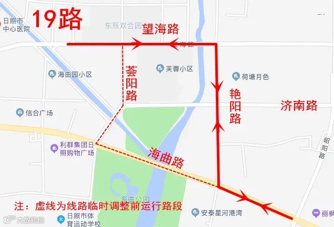 19路:原运行荟阳路(望海路至海曲路)、海曲路(荟阳路至艳阳路)路段停止运行。调整为望海路(荟阳路至艳阳路)、艳阳路(望海路至海曲路)路段运行。临时撤销“东港区民政局、海曲公园、爱尔眼科医院(路北)”站,临时增设“芙蓉社区北门、荷塘月色、艳阳路望海路(路西)、艳阳路海曲路(路东)”站。
