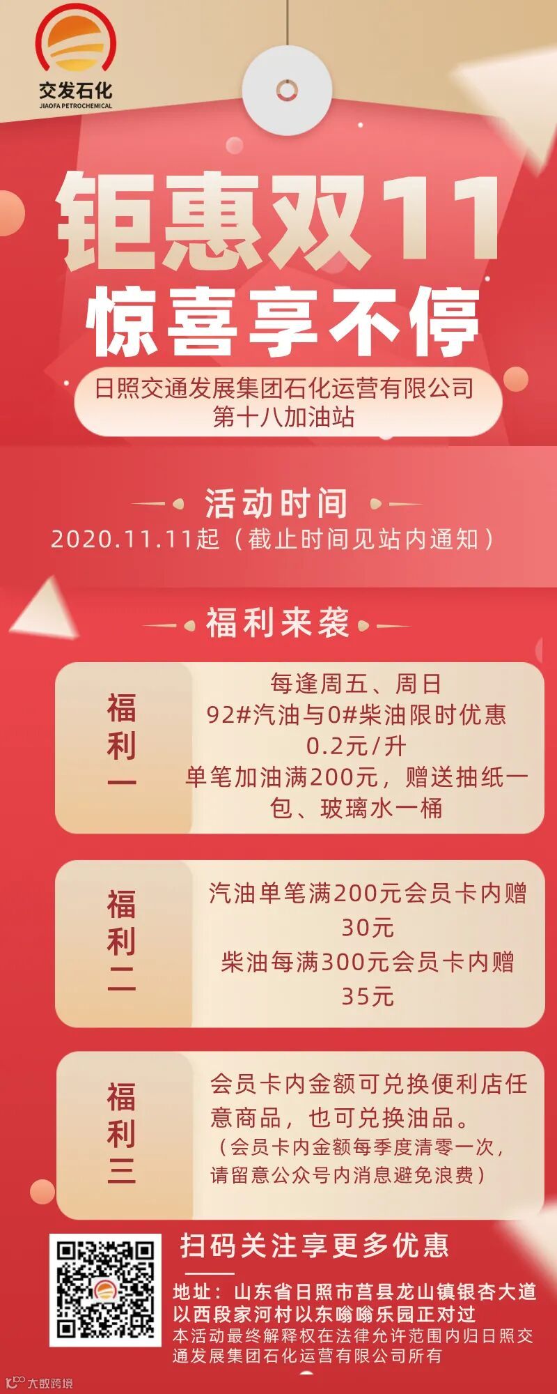这个双十一,福利来袭!为回馈新老客户,日照交通发展集团石化运营有限公司在营加油站降价啦,三重大礼等你来拿!