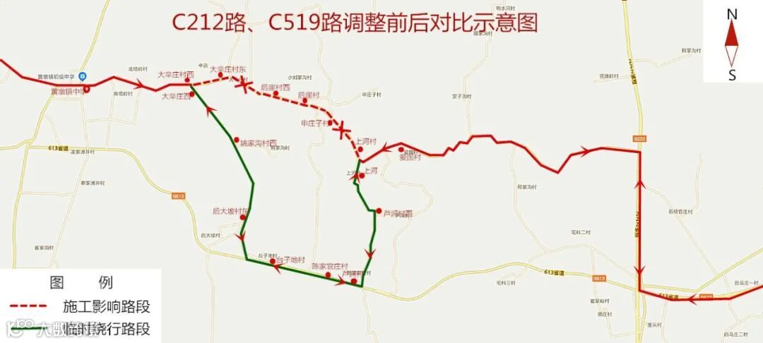 线路恢复路段站点不变;施工影响路段临时撤销“大辛庄村西(路南)、大辛庄村东、后崖村西、后崖村、申庄子村、上河村(路北)”等6处站点,临时增设“大辛庄西(路西)、姚家沟村西、后大坡村东、台子地村、陈家官庄村、芦涧村(路北)、芦涧村西、上河”等8处站点。