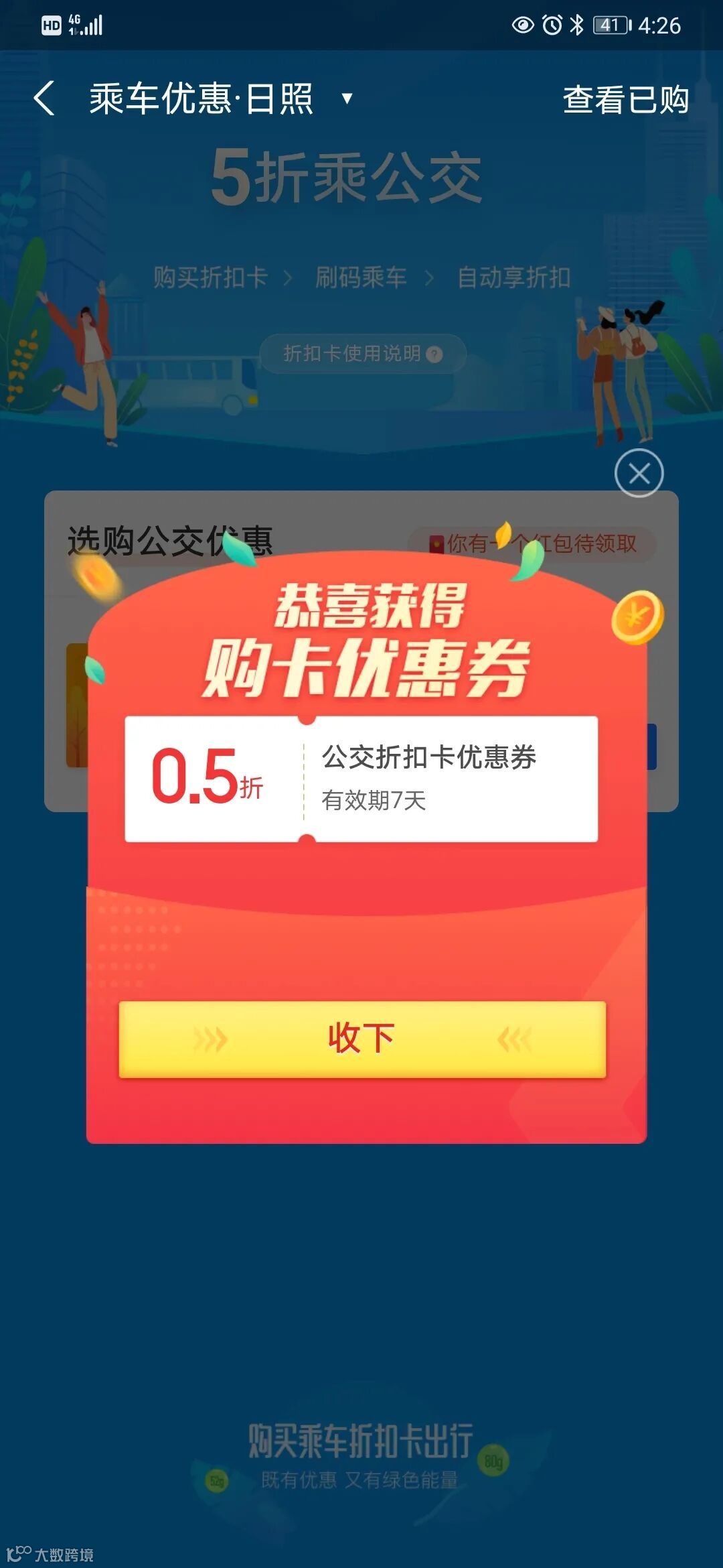 打开支付宝---出行---乘车码(底部)-出行优惠