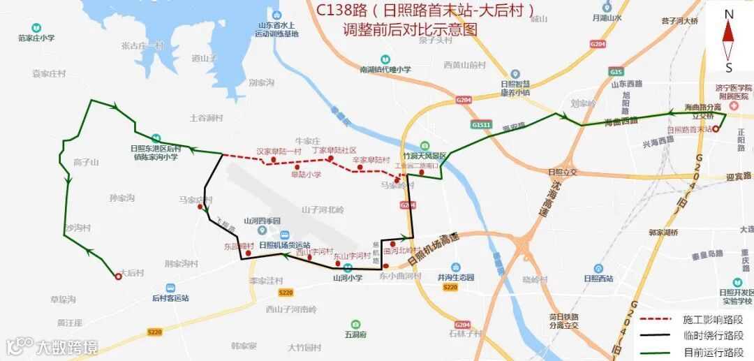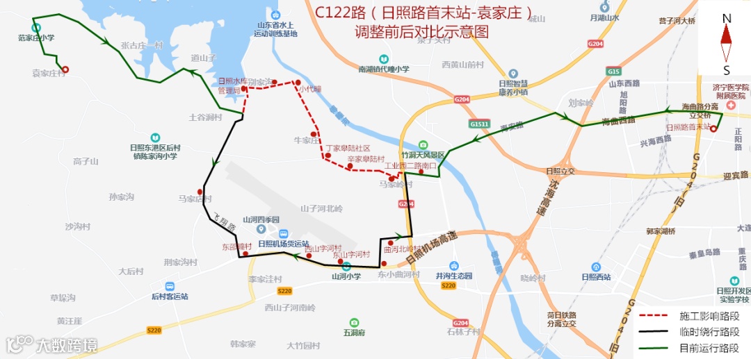 线路调整后原马家岭向西经丁家皋陆、牛家庄、小代疃村至日照水库管理中心路段往返暂停运行;临时调整为由马家岭东沿204国道向南经曲河北岭村、东山字河村、西山字河村、东邵疃村、马家店村至蔡家官庄北恢复原路线运行,其他运行路段不变。