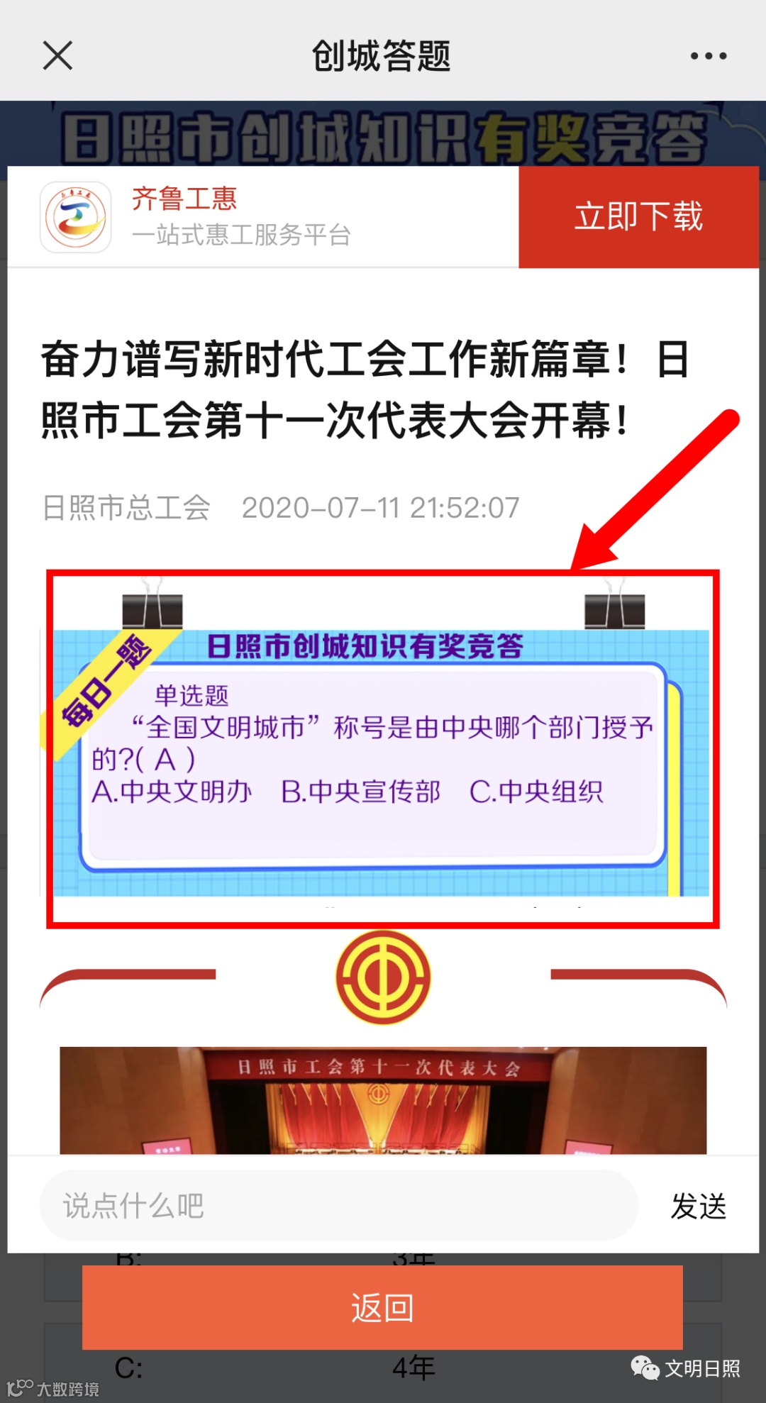 为加大创城工作宣传力度,提高广大市民对创城知识的知晓率,营造浓厚的创城氛围,日照市创城办、日照市总工会联合举办,开展以“争创全国文明城市 共建幸福美好日照”为主题的创城知识网上有奖竞答。