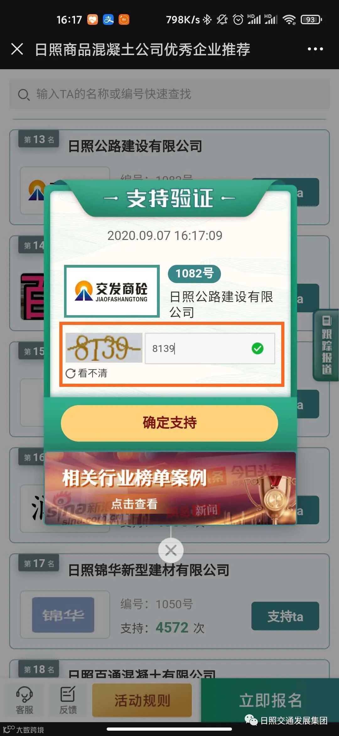 点击本文最底部左下角“阅读原文”后进入投票,找到1082号日照公路建设有限公司,并点击“支持ta”;