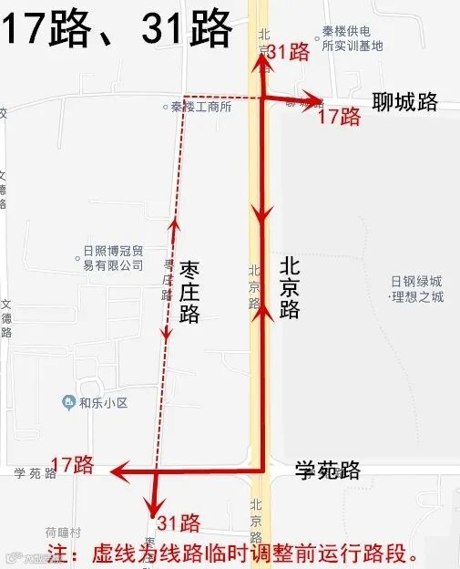 因聊城路(枣庄路至北京路)路段施工,致使运行该路段的公交17路、31路无法正常通行。为最大限度减少道路施工给乘客出行带来的不便,即日起临时调整公交17路、31路,待施工结束后再恢复原线路运行。具体如下: