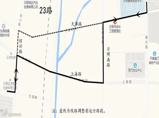 23路:原运行天津路(日照南路至绍兴路)、绍兴路(天津路至上海路)路段停止运行,调整为日照南路(天津路至上海路)、上海路(日照南路至绍兴路)路段运行。撤销“开发区供水工程管理处、绍兴路上海路、天津路绍兴路”站,增设“日照南路天津路(路西)、日照南路上海路(路东)、上海路日照南路”站。线路首班发车时间6:00,末班发车时间19:00。