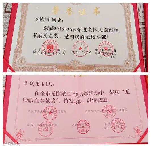 献血证上不断更新的数字记录着李师傅每一次的奉献。献血对于李慎国而言已经成为一种习惯,而在他的感染带动下,单位也相继涌现出一批充满爱心的人。李师傅的爱心也得到了社会的认可,近年来,他先后获得了“2016年度日照市献血明星”“2017年全国献血金奖”等诸多荣誉。每当身边的人问起他为什么可以做到坚持献血这么长时间,李师傅总是不以为然地说:“我也说不好,只是觉得我可以帮助到有需要的人。”