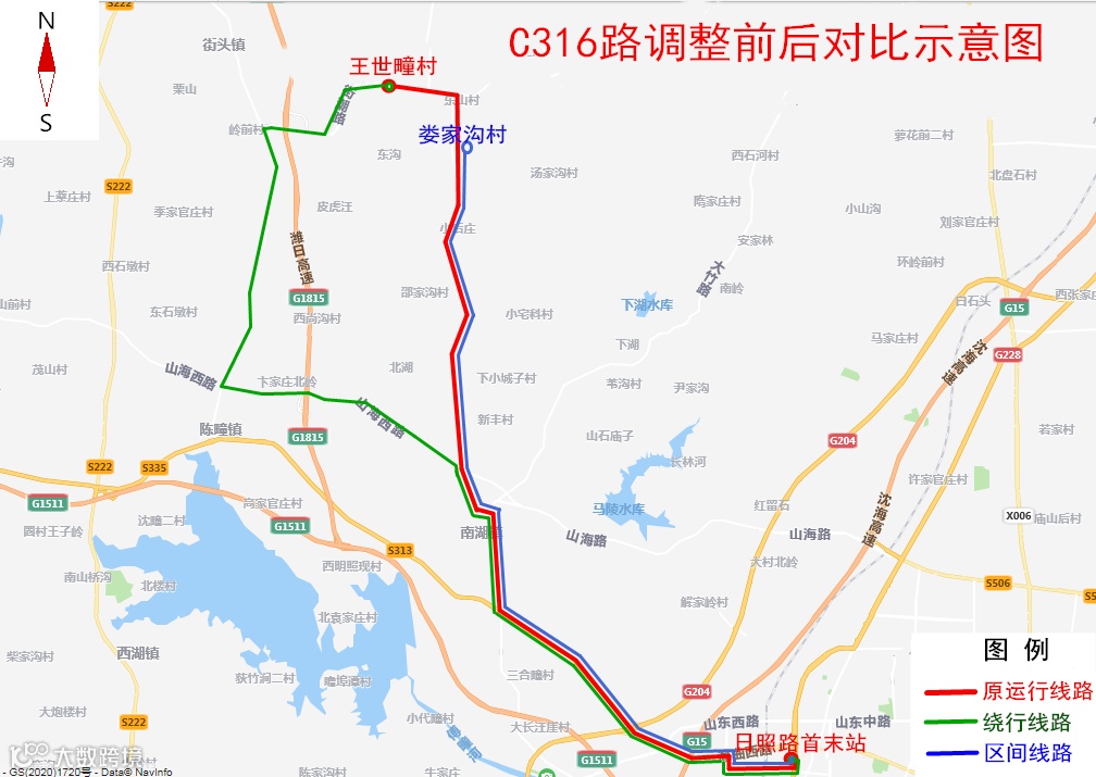 二、为满足山南线(大北湖村至娄家沟村)沿线居民出行需求,线路调整后临时运行日照路首末站至娄家沟村区间车。