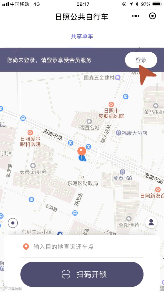 支付完成后返回用车页面点击【扫码开锁】,扫描车锁上的二维码,听到“租车成功”即可。