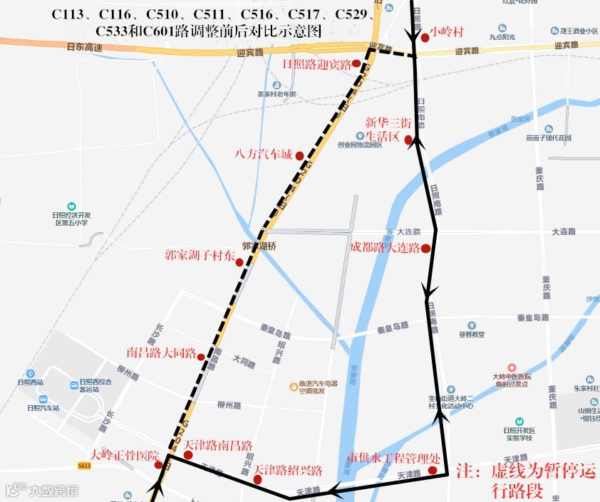 调整后原日照南路与迎宾路交会处沿迎宾路往西、和阳南路往南至天津路路段往返暂停运行,调整为:沿日照南路往南、天津路往西至大岭正骨医院站(路西)往返运行,其他运行路段不变。