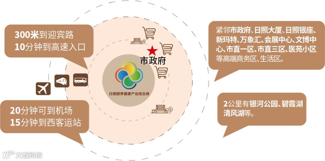 项目位于日照市核心地段,区位优势明显,距离迎宾路快捷路300米,10分钟即可上高速,15分钟可达日照西综合客运站,20分钟可到机场;紧邻市政府、日照大厦、市直一区、市直三区、医苑小区、日照银座、新玛特、万象汇等高端商务区、生活区,亲属看望老人方便;周边2公里内有会展中心、文博中心、银河公园、碧霞湖、清风湖等,方便老人散步。