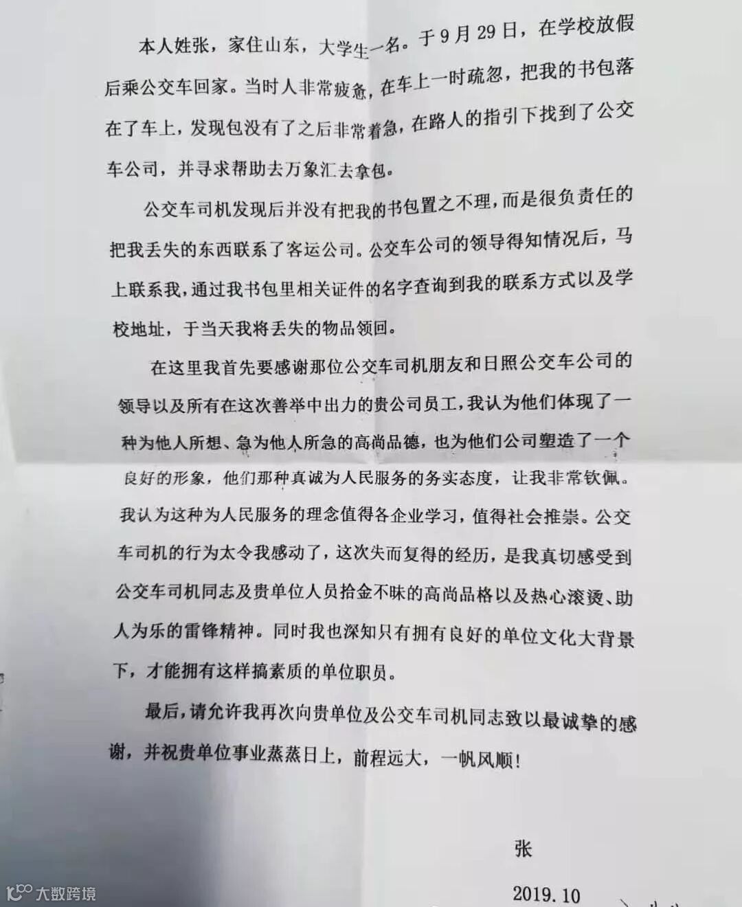 这不10月24日下午,日照海事学院的张荣荣同学亲自到公司办公室送来了一封感谢信。