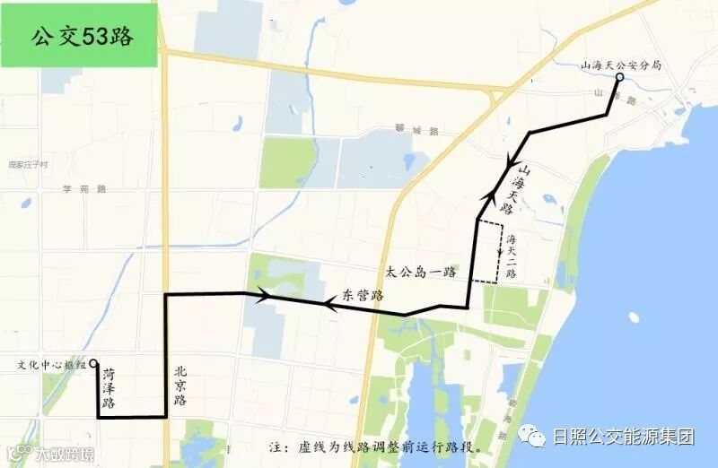 (二)调整后,原运行太公岛二路(山海天路至海天二路)、海天二路(太公岛二路至太公岛一路)、太公岛一路(海天二路至山海天路)路段停止运行。由“海天园”站经山海天路向北至“山海天公安分局”站,往返运行。撤销“亲海苑(路南)、海天二路怡海路(路西)、一中东校(路北)”站。增设“一中东校西门(路西)、海天园(双向)、山海天实验小学(双向)、前滩西(路西)、后滩西(双向)、伴海山庄(双向)、山海天路山海路(双向)、山海天公安分局(路西)”站。