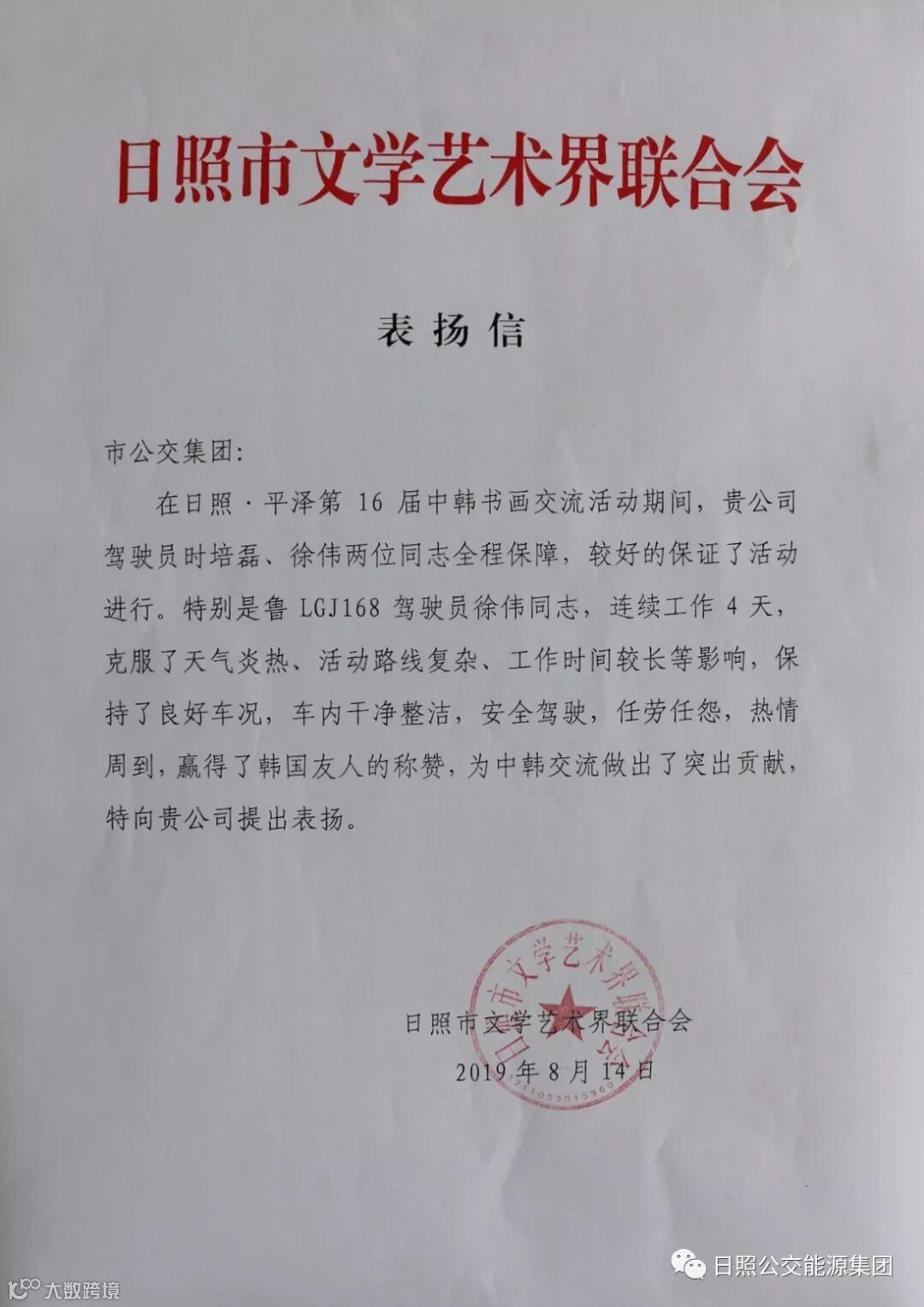 在日照·平泽“第16届中韩书画交流活动”期间,集团车辆运营服务有限公司驾驶员徐伟同志为活动人员提供了全程保障服务。工作期间因表现突出、服务态度真诚,徐伟同志不久就收到了来自市文学艺术界联合会的表扬信。