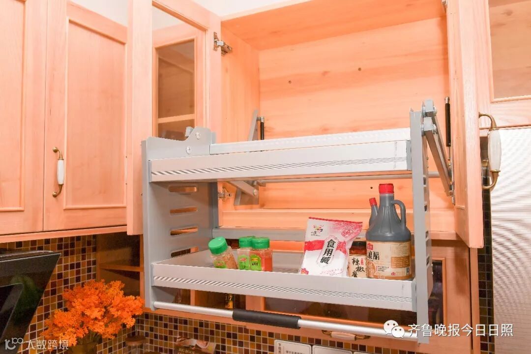 下拉式储物篮,便于老人使用上柜空间,满足不同身高老人的取用物品需求。