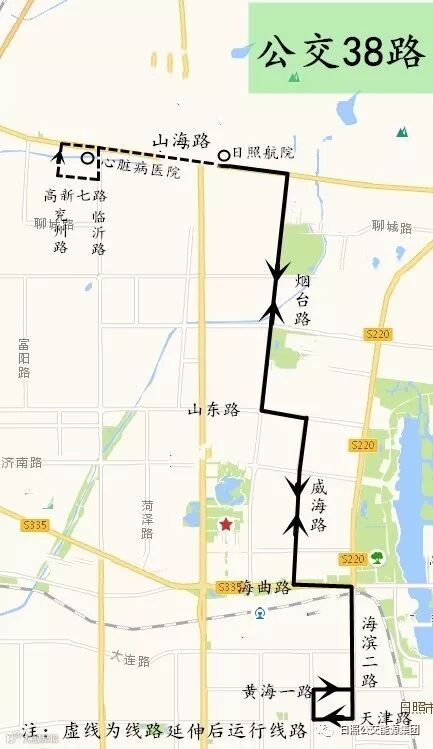 公交38路调整后,自“日照航院”站沿山海路向西、临沂路向南、高新七路向西、兖州路向北、山海路向东至“心脏病医院”站运行。原起讫站“日照航院”调整为“心脏病医院”。增设“厉家村、后团岭埠北、技师学院北、技师学院(路西)、高新七路兖州路、心脏病医院”站。