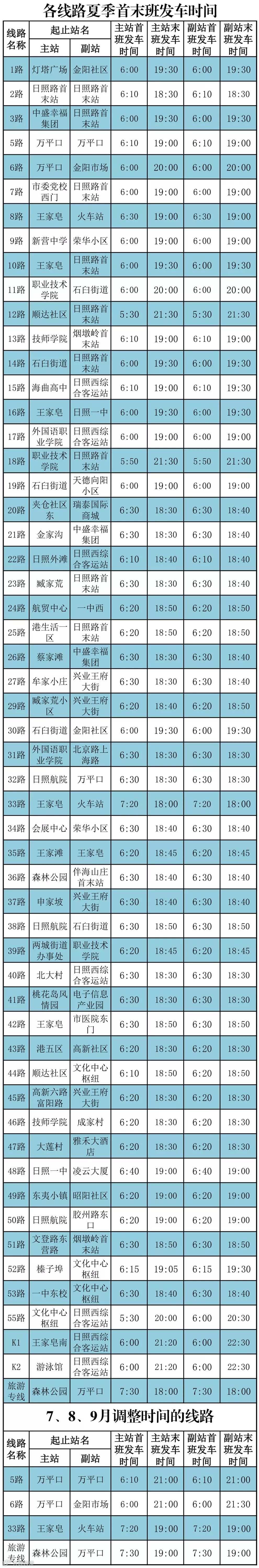 自4月1日起至10月31日,日照市公共汽车有限公司所属公交线路(城市公交)将执行夏季运营时间。夏季各线路末班发车时间比冬季平均延后30分钟左右,特提醒广大市民注意。