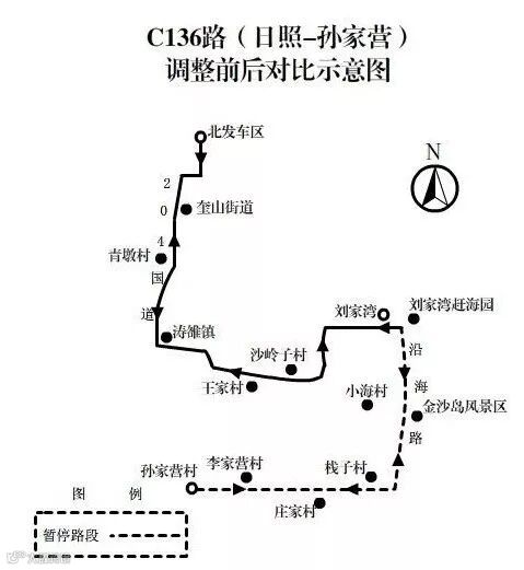 二、C136路(日照至孙家营)因孙家营村向西至204国道路段同步施工;调整后原南沿海路(刘家湾村东至栈子村)、村村通(栈子村至孙家营)往返暂停运行,调整为刘家湾村为临时首末站往返运行,其他运行路段不变。