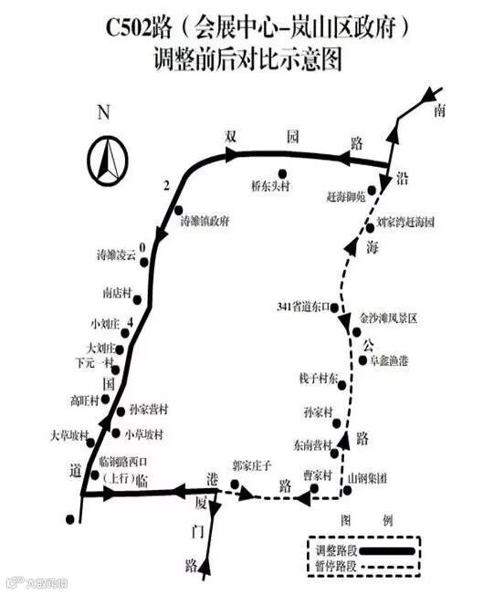 一、C502路(会展中心至岚山区政府)调整后原南沿海路(双园路东口至临钢路)往返暂停运行,调整为沿双园路向西至204国道;沿204国道向南经涛雒镇、高旺村、临钢路西口至厦门路往返运行,其他运行路段不变。临时撤销“赶海御苑、刘家湾赶海园、341省道东口、金沙滩风景区、阜鑫渔港、栈子村东、孙家村、东南营村、山钢集团、曹家村、郭家庄子村”站点。临时增设“涛雒镇政府、涛雒凌云、南店村、小刘庄村、大刘庄村、下元一村、高旺村、孙家营村、小草坡村、大草坡村、临钢路西口(上行)”。